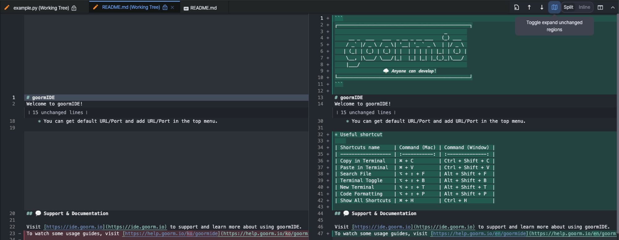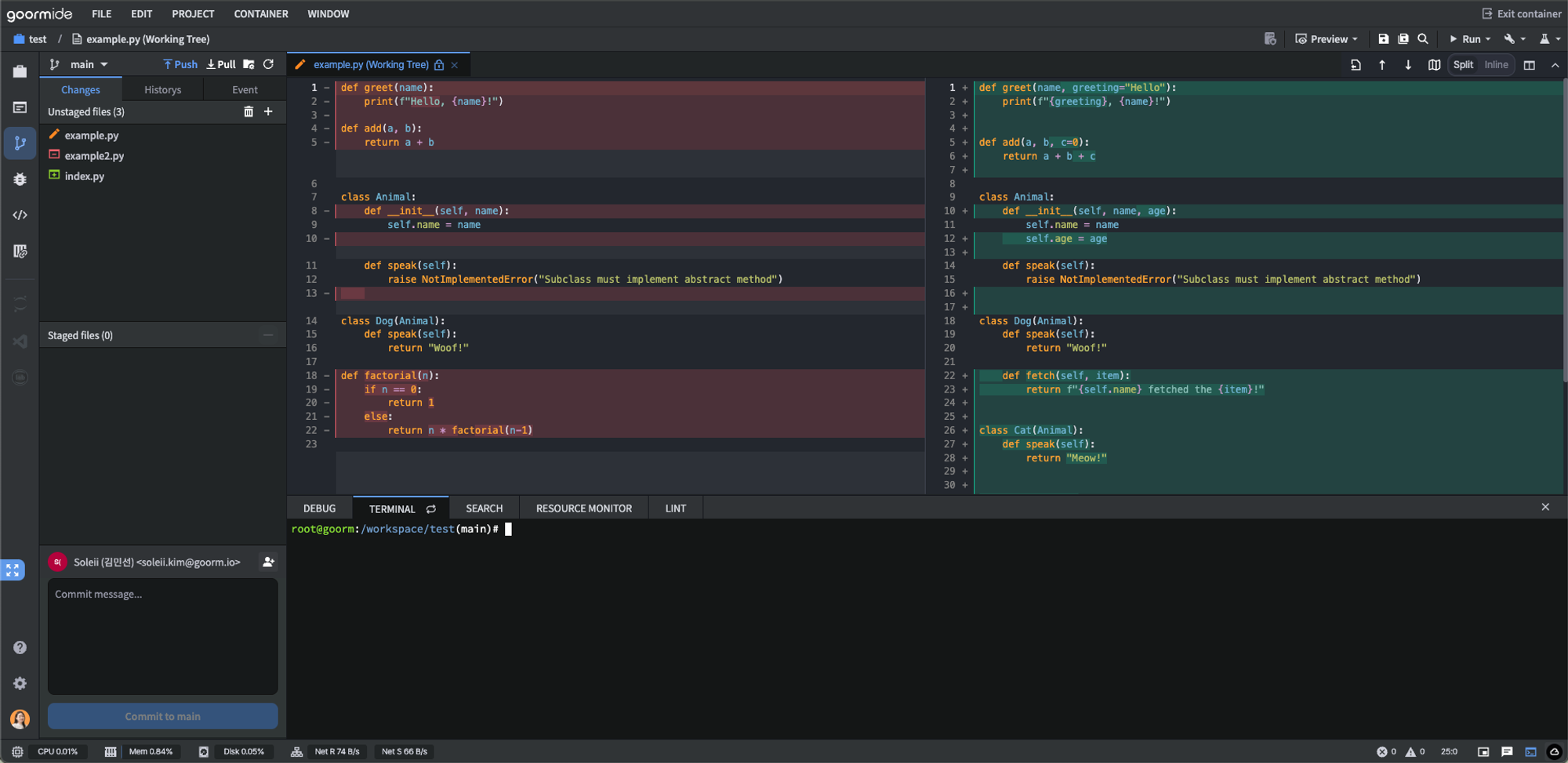 Diff lets you see what changes have been made in your goormIDE before committing to your linked Git account.