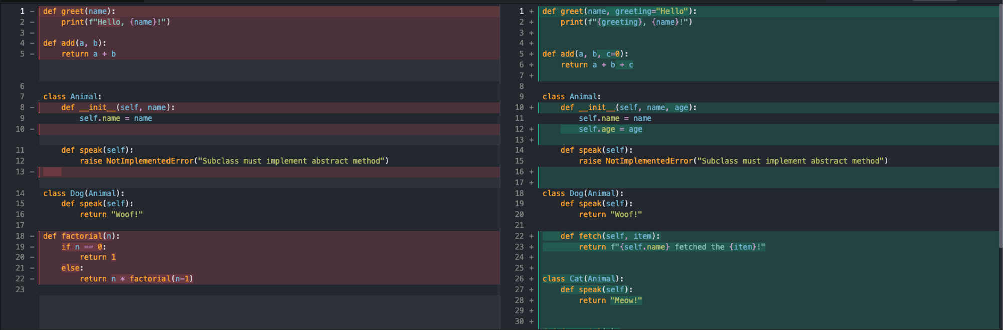 In the pre-change source code, lines of code that were deleted are highlighted in red and marked with a - next to the line number. In the after-change source code shows the lines of code that were added with a green highlight and a + next to the line number. Also, the code that was actually changed is highlighted darker.