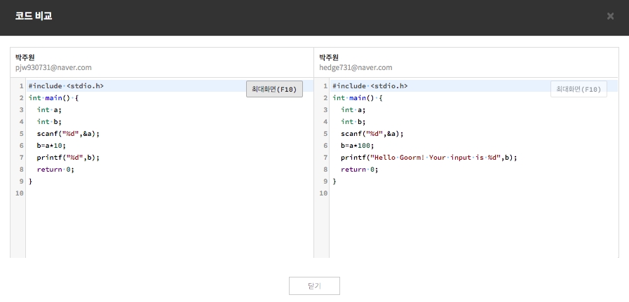 코드비교 팝업 창이 나오고, 이 팝업 창에서 두 지원자의 소스 코드가 어떻게 비슷한지 볼 수 있습니다.