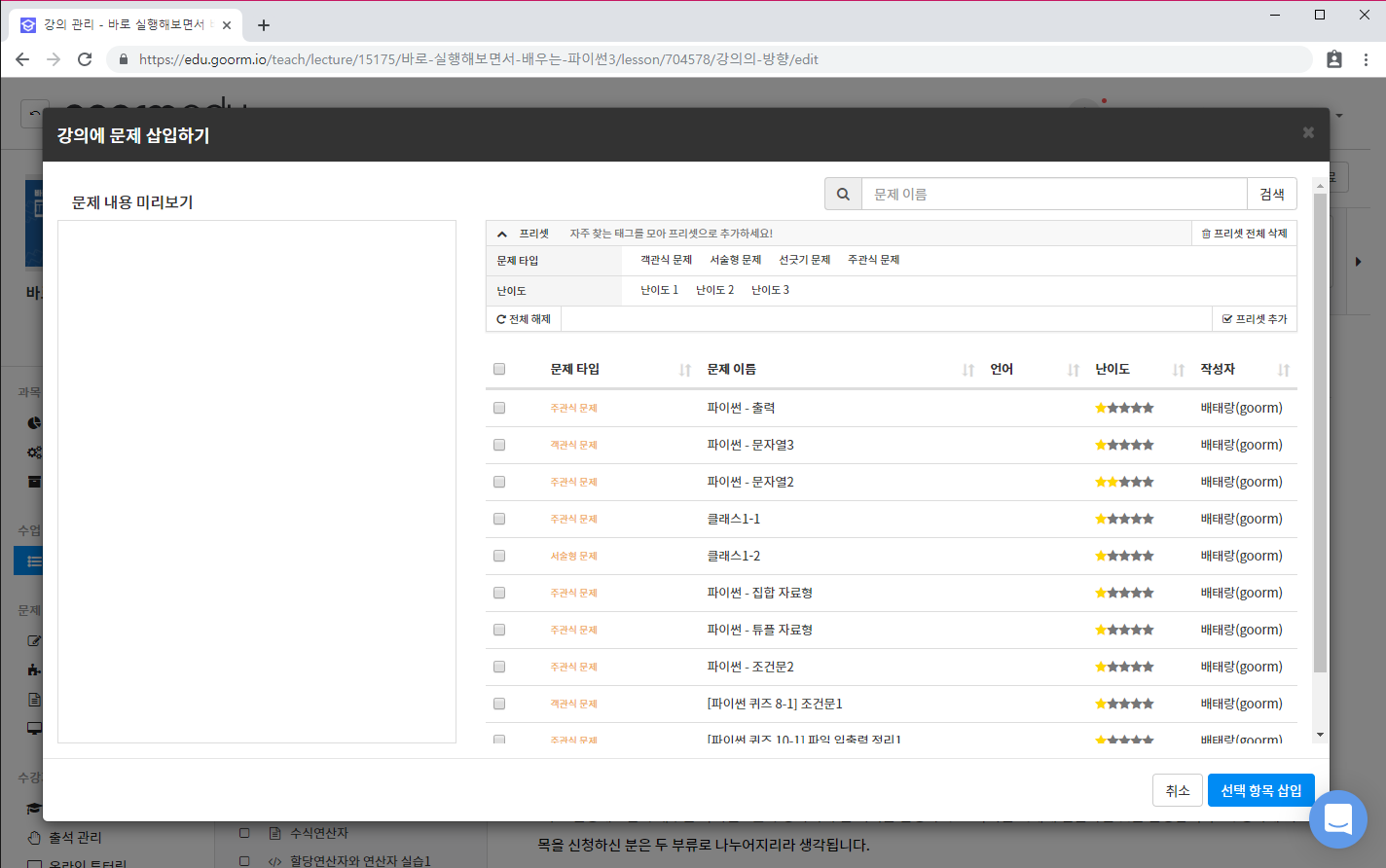 추가할 문제를 모두 선택한 후, '선택 항목 삽입' 버튼을 누르면