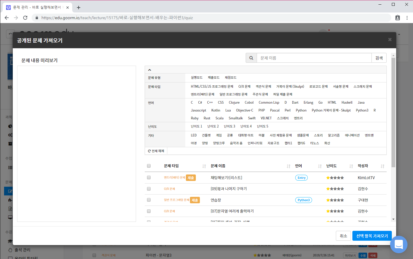 아래는 '문제 가져오기' 클릭 시 확인할 수 있는 인터페이스 입니다.