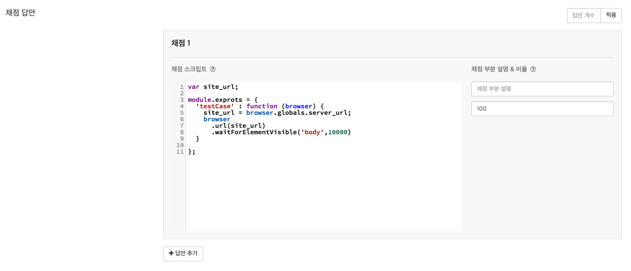 var site_url;: 어떤 사이트로 접속할 지 URL을 저장하기 위한 변수의 선언부입니다.module.exports = {: node.js의 문법으로써 사용자 모듈을 만드는 과정입니다.{이하로 할당되었기 때문에 여러 테스트 메소드를 가지는 객체가 될 것입니다.'case' : function (browser) {: 테스트 케이스의 이름과 거기에 할당되는 테스트 메소드입니다. 이 코드에서는 'case' 이라는 이름으로 작성이 시작되었습니다.site_url = browser.globals.server_url;: 구름EDU에서 자동으로 실행되는 웹 서버의 주소는browser.globals.server_url이라는 곳에 그 값이 미리 들어가 있습니다. 따라서 비어있는site_url에 채점하고자 하는 대상 웹서버 주소, 즉 수강자가 작성한 코드가 실행되는 웹 서버의 주소를 넣어주는 과정입니다.browser: Nightwatch.js 에서는 가상의 웹브라우저가 객체 형태로 각각의 테스트 메소드에 전달됩니다. 이browser는 우리가 개념적으로 알고 있는 웹브라우저로서, 눈에 보이지는 않지만 마치 웹브라우저처럼 동작하는 가상의 객체라고 이해하면 됩니다..maximizeWindow(): maximizeWindow라는 메소드는 테스트용 브라우저의 윈도우 화면을 최대화 하라는 뜻입니다. 화면이 작아서 웹 페이지가 모바일용 형태로 보인다던지 하는 예외상황을 막아줄 수 있습니다..url(site_url): url이라는 메소드는 해당 url로 이동하라는 뜻입니다..waitForElementVisible('body', 2000): waitForElementVisible이라는 메소드는 첫번째 파라메터인 body태그가 보일 때까지 최대 2000밀리세컨(2초)동안 기다린다는 뜻입니다. 이 테스트 케이스에서 이 메소드는 해당 웹 url을 통해 접속을 하는데, 웹 페이지의 body 태그가 로딩될 때까지 최대 2초동안 기다린다는 맥락을 가지고 있습니다. 만약 2초 내에 body 태그가 보이지 않으면, 이 테스트 케이스는 실패로 끝나게 됩니다..waitForElementVisible('#id', 2000): 8번째 라인의 메소드와 같으며, id값이 id인 태그를 최대 2초동안 기다린다는 뜻을 가지고 있습니다. 해당 문제는 id만 입력하여 로그인을 하는 문제이며, id값이 id인 태그는 사용자의 아이디를 입력하는 Text input태그입니다..setValue('#id', 'Anonymous'): setValue라는 메소드는 #id라는 셀렉터, 즉 id값이 id인 태그에 'Anonymous'라는 문자열 값을 입력하라고 하는 뜻을 가지고 있습니다. 만약 #id라는 셀렉터에 해당되는 DOM이 없다면 이 테스트 케이스는 에러로 끝나게 됩니다..click('#login'): click이라는 메소드는 #login이라는 셀렉터, 즉 id값이 login태그를 클릭하라는 뜻을 가지고 있습니다. 만약 #login이라는 셀렉터에 해당되는 DOM이 없다면 이 테스트 케이스는 에러로 끝나게 됩니다..url(site_url): url이라는 메소드는 7번째 라인의 내용과 같습니다..pause(200): pause라는 메소드는 200 밀리세컨(0.2초)만큼 잠시 멈추라는 뜻을 가지고 있습니다. 웹 페이지가 랜더링 되는 시간을 기다리는 부분입니다..waitForElementNotPresent('form', 2000): waitForElementNotPresent라는 메소드는 form 태그가 보이지 않게 될 때 까지 최대 2000밀리세컨 (2초)까지 기다린다는 뜻입니다. 로그인 한 뒤 form 태그가 보이지 않게 되는지 확인하는 부분입니다.