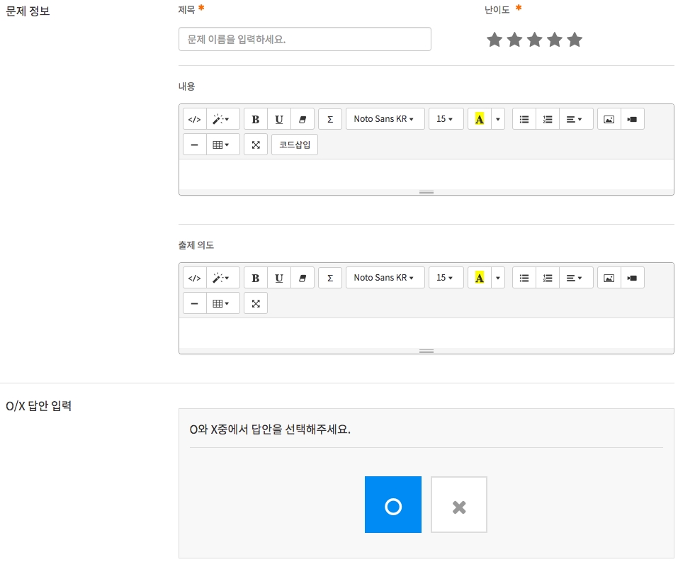 'O/X 문제'를 만드는 화면입니다. 문제 제목과 설명을 입력하고 'O/X 답안 입력' 탭에서 답안(O 또는 X)을 설정할 수 있습니다.