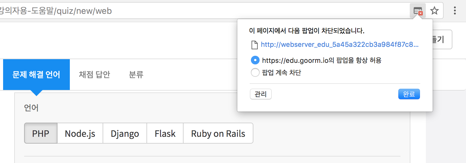 만약 작업중인 웹 브라우저에 팝업차단이 설정되어 있다면