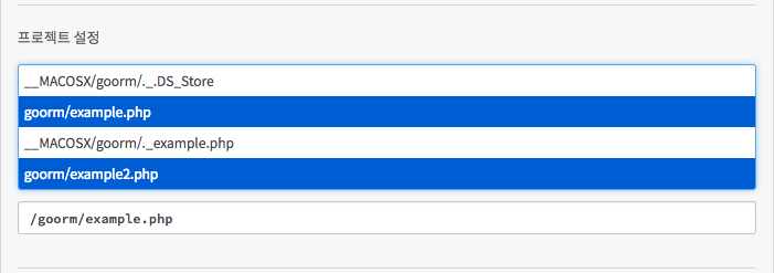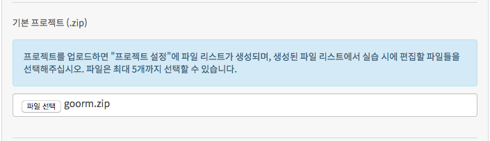 '기본 프로젝트' 탭에서 zip 형식으로 압축된 웹 프로젝트 파일을 업로드하면, '프로젝트 설정' 탭에서 해당 압축파일 내부에 있는 파일 리스트가 나타납니다. 프로젝트 파일 내부에 실행파일이 지나치게 많을 경우 문제만들기가 실행되지 않을 수 있습니다.