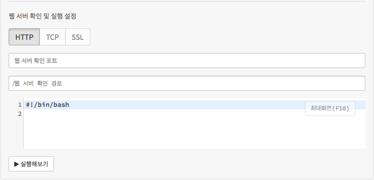 첫번째 입력란을 보면 HTTP / TCP / SSL의 세가지 항목이 있는데, 이는 웹 서버 실행 확인 방법을 의미하며, 현재는 HTTP만 지원하고 있습니다. TCP와 SSL는 추후 확장될 가능성에 의해 인터페이스가 유지되고 있습니다. HTTP 방식은 두번째 및 세번째 입력란에서 지정한 값을 토대로 URL을 만들어서 해당 URL에 HTTP 요청에 대한 응답 코드의 값이 200인지 확인하는 방식을 의미합니다.