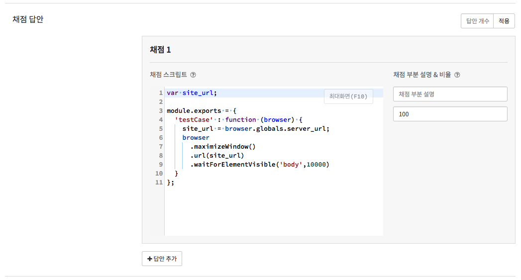 채점모드의 경우, 출제자가 입력한 Nightwatch 테스트 코드를 이용해서 채점을 실시하고 점수를 산정합니다.