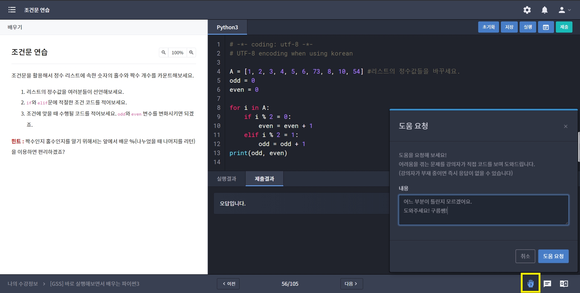수강자는 구름EDU 실습화면 오른쪽 하단에 손모양 아이콘을 클릭해 질문을 작성하고, 도움 요청을 합니다.