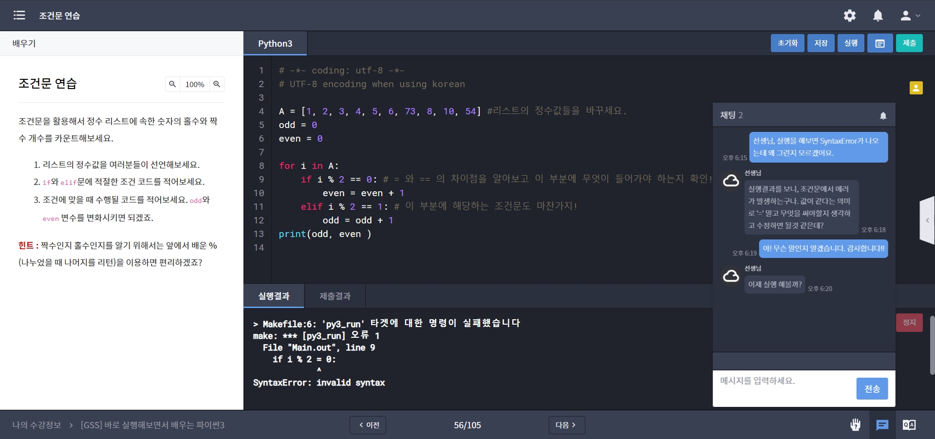 채팅 : 한 프로그래밍 실습 화면에 협업하고 있는 강의자와 수강자는 채팅으로 의견을 쉽게 나눌 수 있고, 기록에도 남아있어 추후 복습하는 데도 도움이 됩니다.