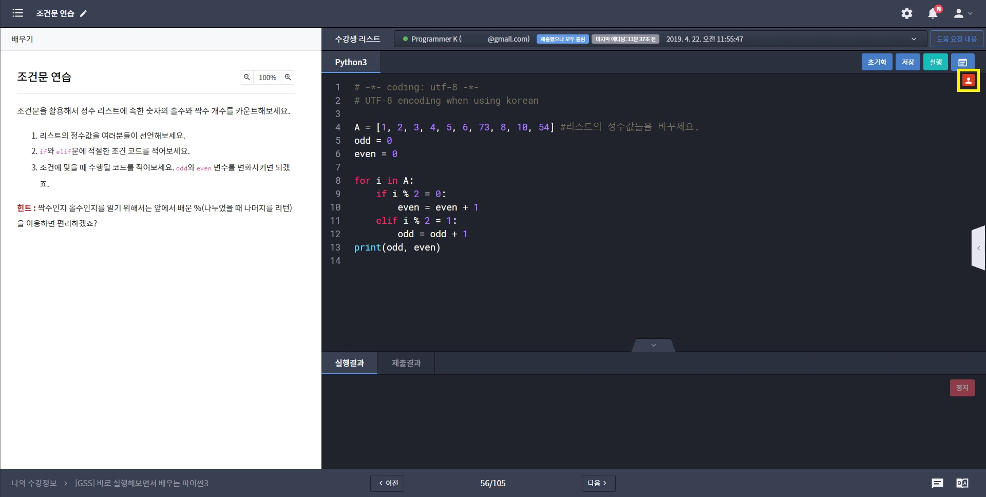도와주기 실습화면에 접속하면 하나의 프로그래밍 실습화면을 강의자와 수강자가 공유하게 됩니다. 오른쪽 상단에 빨간색 사람모양 아이콘은 프로그래밍 실습화면을 공유하고 있는 유저를 알려줍니다. 마우스를 올리면 유저의 이름이 표시됩니다.