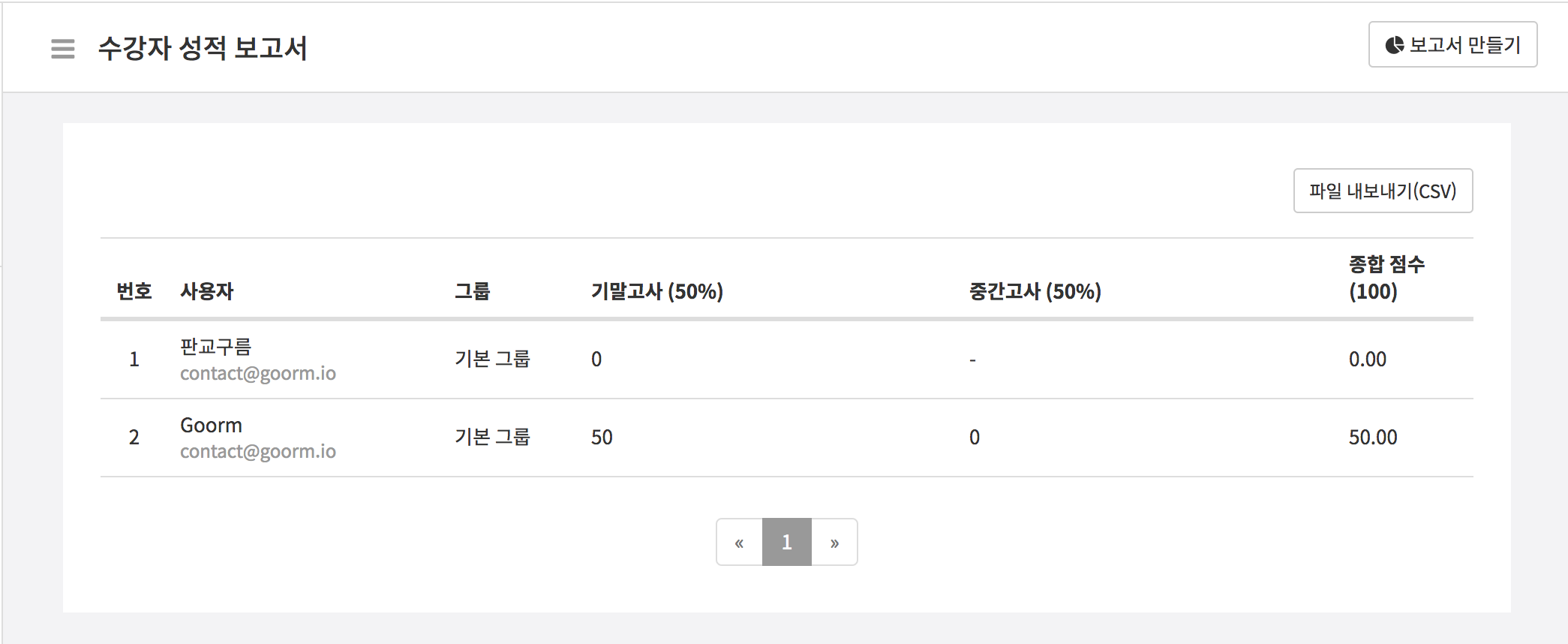 '파일 내보내기' 버튼을 통해 생성된 성적 보고서를 csv 파일로 다운로드할 수 있습니다.
