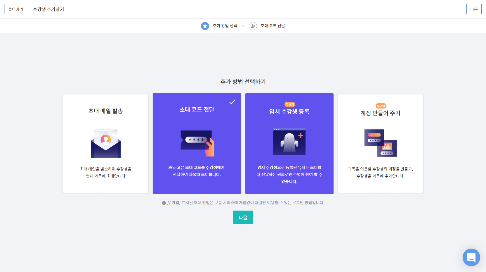 '초대 메일 발송, 계정 만들어 주기' 방법은 채널 사용자 추가 방법과 동일하며, 강좌 초대 방법에서 추가되는 '초대 코드 전달, 임시 수강생 등록' 방법에 대해 알아보겠습니다.