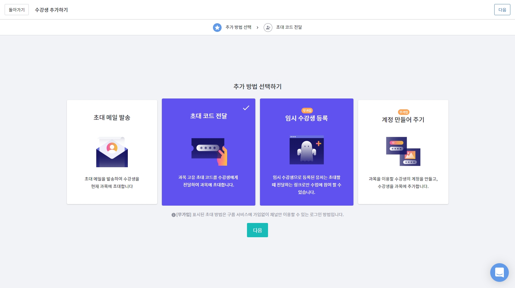 신규 수강생 초대하기를 누르면 아래와 같이 4가지 방법이 나옵니다.
