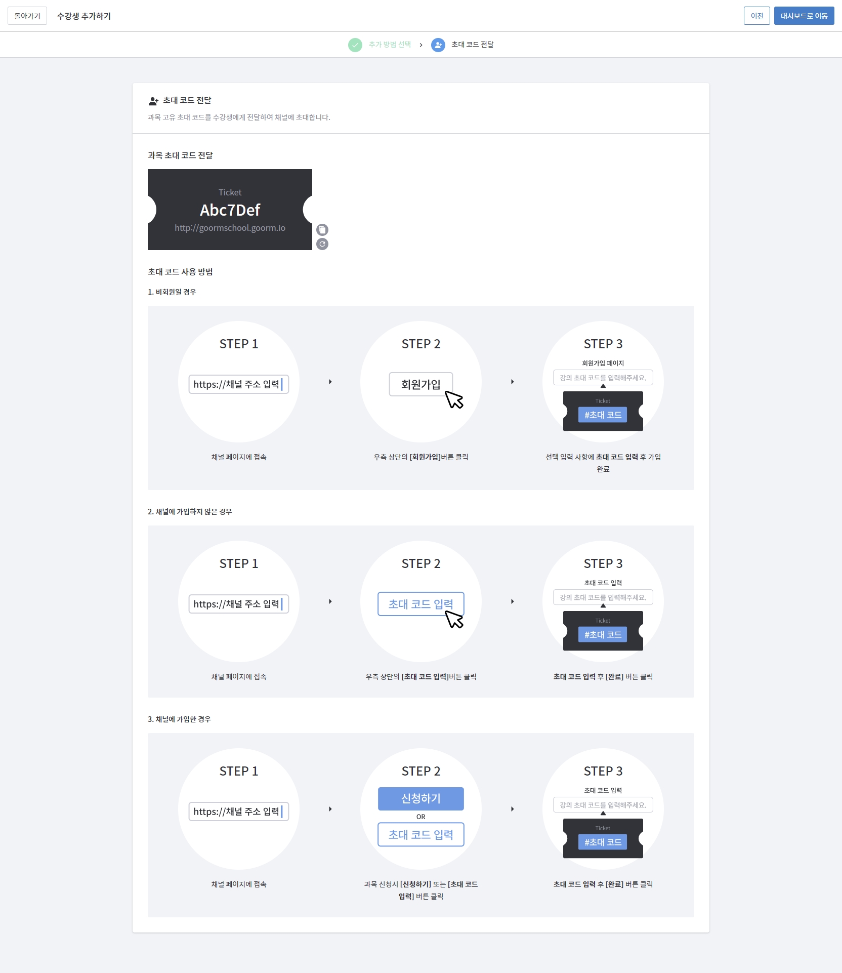 특정 과목의 고유 코드를 수강자에게 전달하여 초대하는 방법으로 회원가입 가능한 대상에게 간편하게 초대할 수 있는 기능입니다.