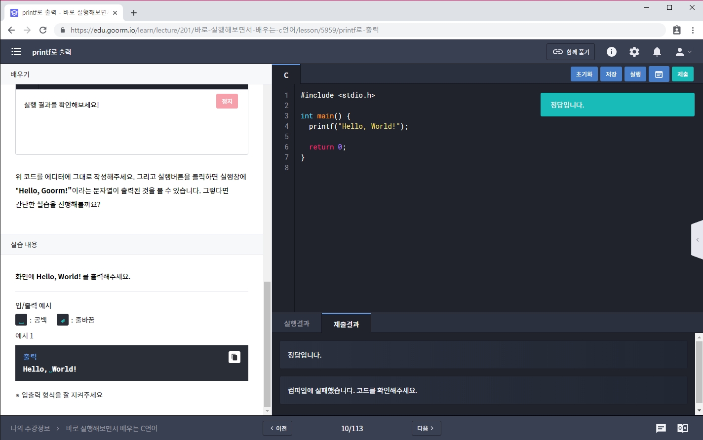 제출 : 강의자에게 소스 코드를 답안으로 제출합니다. 제출한 답안이 맞는 경우 >