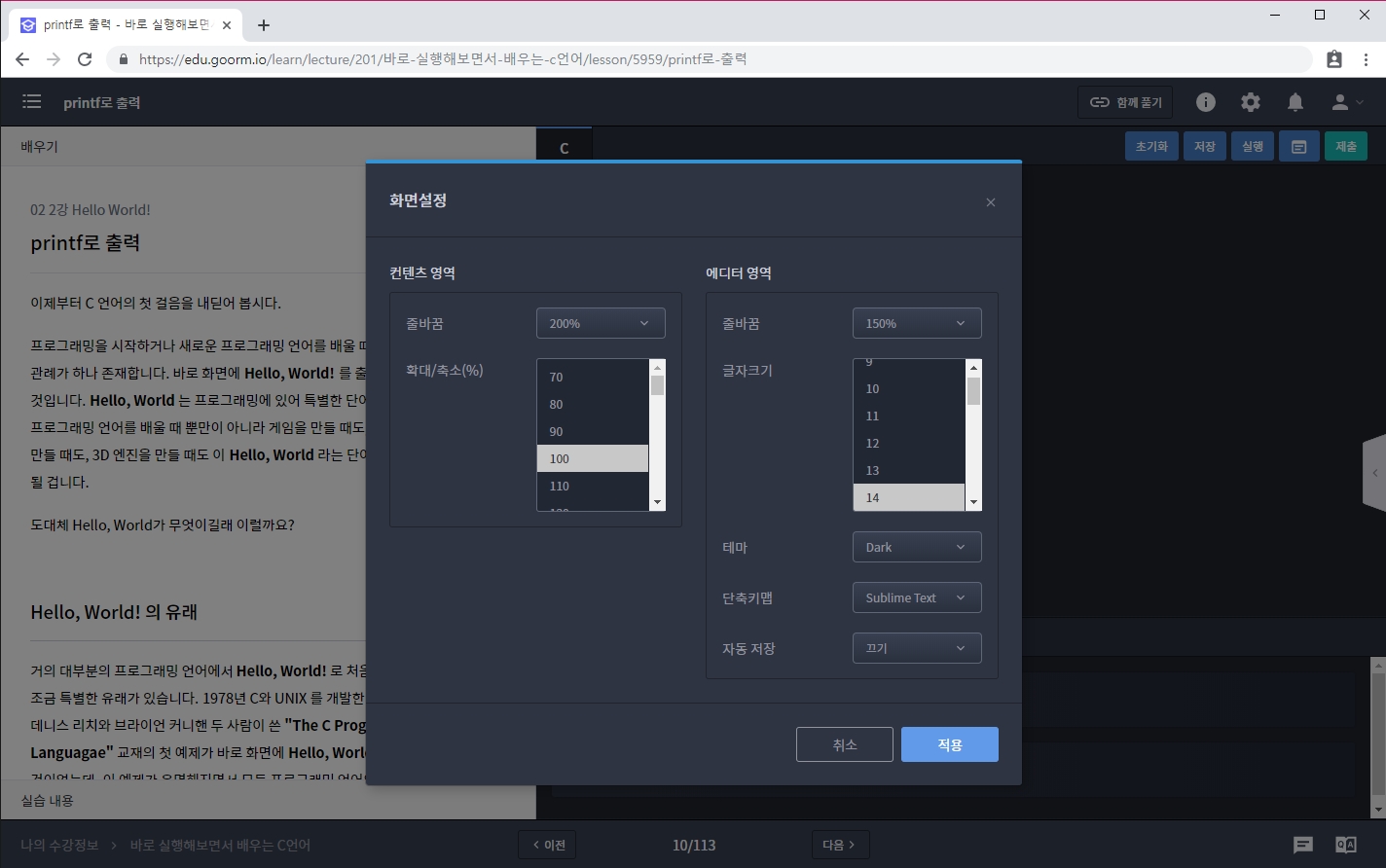 : 컨텐츠 영역과 에디터 영역 화면 설정 창 줄바꿈, 확대/축소, 줄간격, 화면크기, 글자크기, 테마, 단축키맵, 자동 저장 옵션을 조정할 수 있습니다. - 줄바꿈 : 90% ~ 300% 범위에서 10% 간격으로 조정할 수 있습니다. - 확대/축소 : 70% ~ 400% 범위에서 10% 간격으로 조정할 수 있습니다. - 글자크기 : 9 ~ 32pt 범위에서 1pt 간격으로 조정할 수 있습니다. - 테마 : Dark, Light 두 가지 테마를 지원합니다. - 단축키맵 : Default, Sublime Text, Emacs, Vim 을 지원합니다. - 자동 저장 : 켜기로 설정하시면 별도로 저장을 클릭하지 않아도 학습하시던 코드가 저장 됩니다.