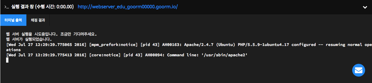 링크를 클릭하면 실행된 웹 서버에 접속할 수 있습니다. 웹 서버가 실행되면, 실행 결과 창에 아파치2 웹 서버의 에러 로그를 볼 수 있고, 키 입력은 불가능합니다.