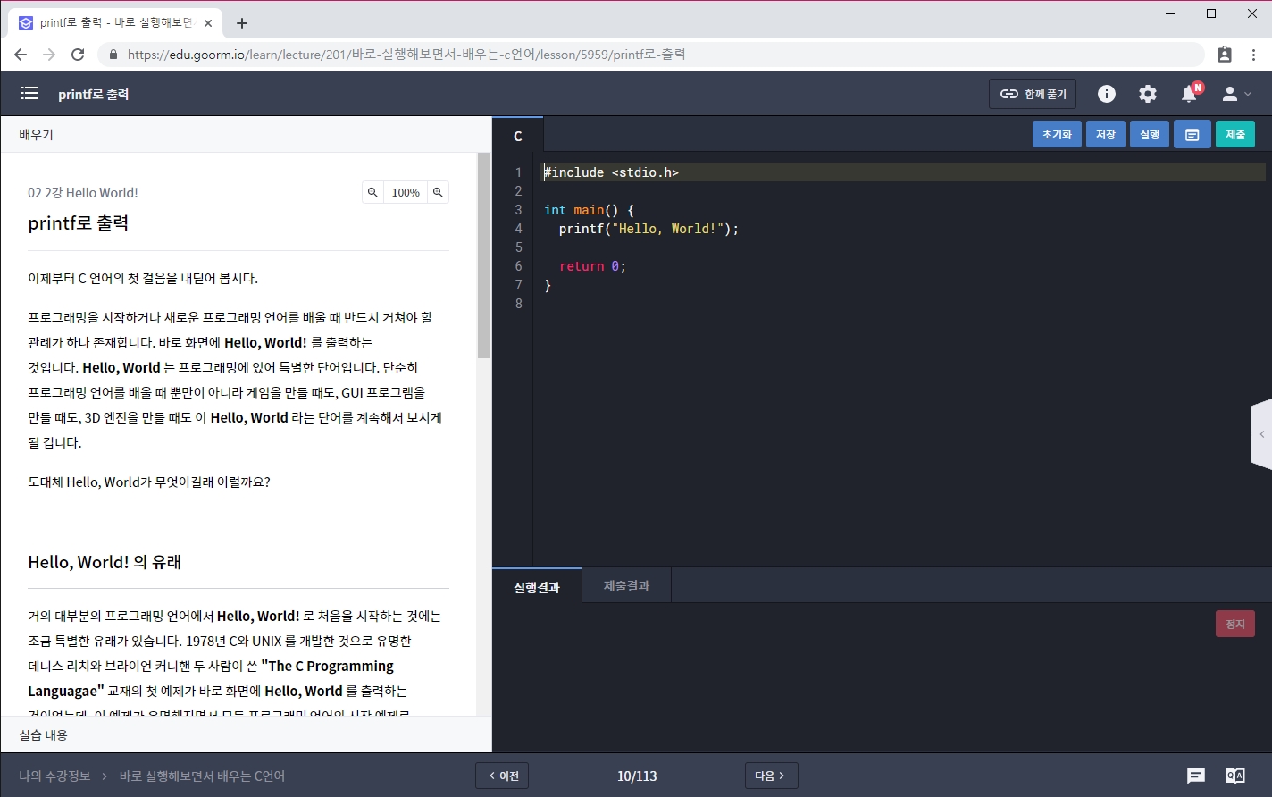 일반 프로그래밍 문제 인터페이스입니다. 1) 좌측에 이론 설명과 실습 내용이 주어집니다. 2) 주어진 내용을 바탕으로 원하는 언어를 선택하여 기본 예제 코드가 주어진 에디터에 답안을 작성합니다. 3) 작성된 답안을 제출하면 채점 결과를 알 수 있습니다.