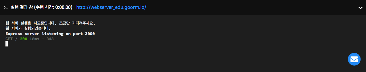 생성된 링크를 클릭하면 작성&실행한 웹 서버에 접속할 수 있습니다. 웹 서버가 실행되면, '실행 결과' 창에 웹 서버 로그를 볼 수 있고, 키 입력은 불가능합니다.