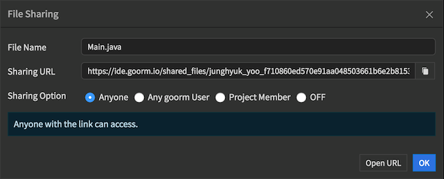 파일을 공유할 수 있는 '공유 주소'가 만들어집니다. 공유 범위를 설정할 수 있고, 만들어진 주소로 접속하면 공유된 파일을 구름 코드 뷰어로 볼 수 있습니다.